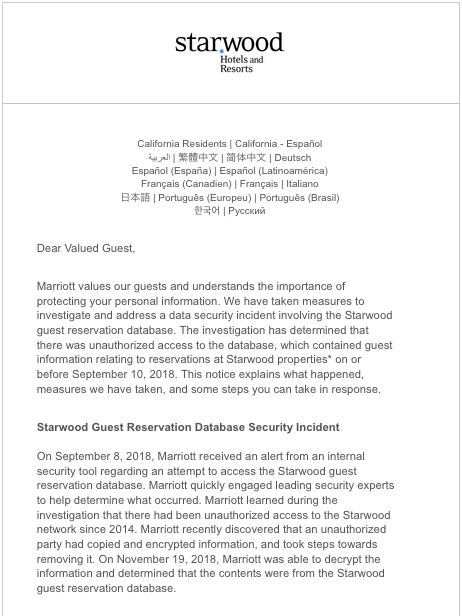 一昔前は大騒ぎでしたが今では常態化。今まさに時代や世代が入れ替わりつつあり「漏れて当然」派が増えています。目に見える人間すら粗末にする時代に目に見えない情報ですから疎かになるわけです。近年オジサンが当選した漏洩事故はJTBの約680万人分の1人でした。つい最近はFBでも約680万件のニュースを見ました。そこに届いたのがスターウッドからのメール。