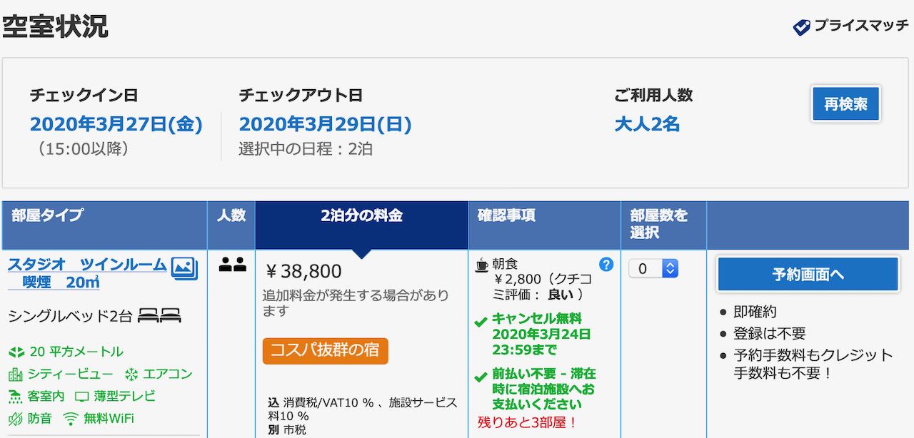 当然先のホテル価格が気になったのでご本家ブッキングドットコムで探すと(たぶん)同カテゴリーは38,800円と思われます。