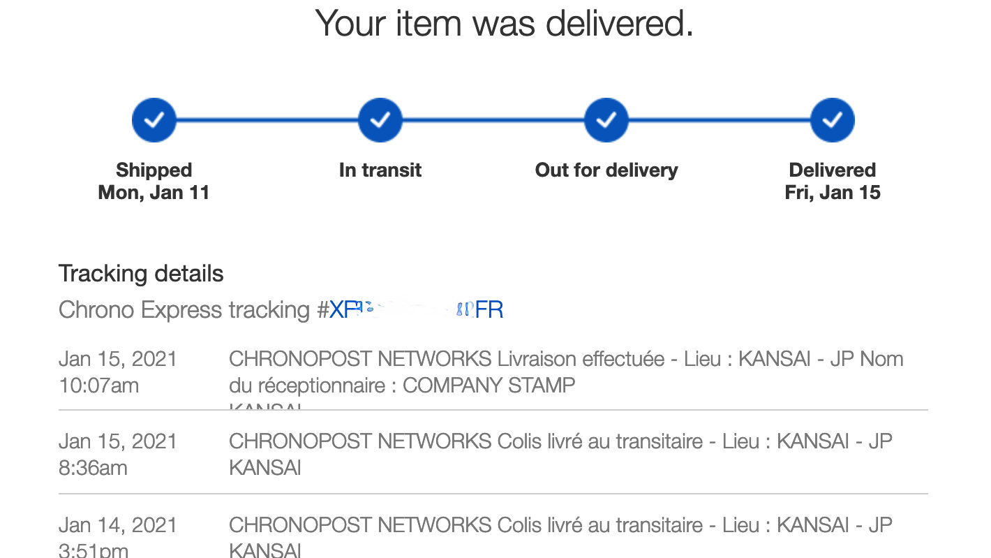 日本からの発送は正しく丁寧に住所を書かないと現地で迷子になる確率が高い便ですが、なんと国際区間はDHLでして1/11に注文した荷物を香港経由で1/15到着というハイスピードぶり。
