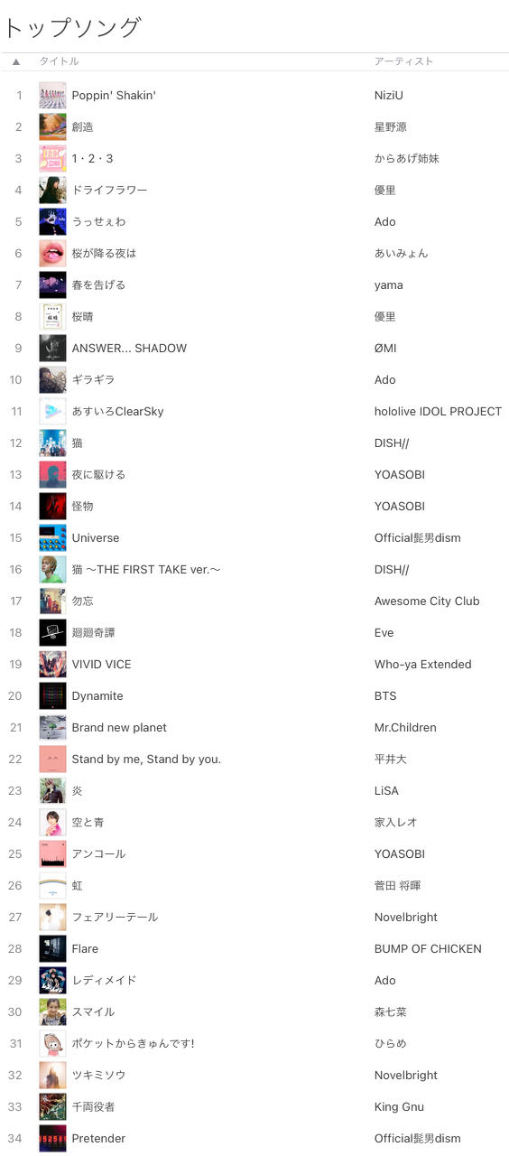 久しぶりに音楽ランキングを眺めましたが100以内アーティストでデータを持っているアーティストは2名だけでした。たったの2人。