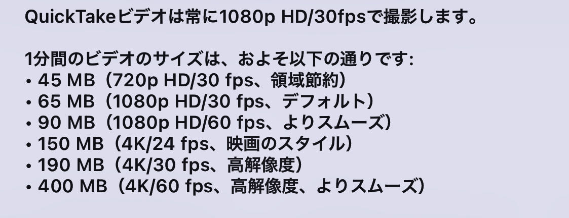 ちなみにiPhone12のカメラ設定画面に書かれております通り1分で400MB食うサイズが「4K60p」ということです。おそらくiPhone13でもほぼ一緒と思われます。