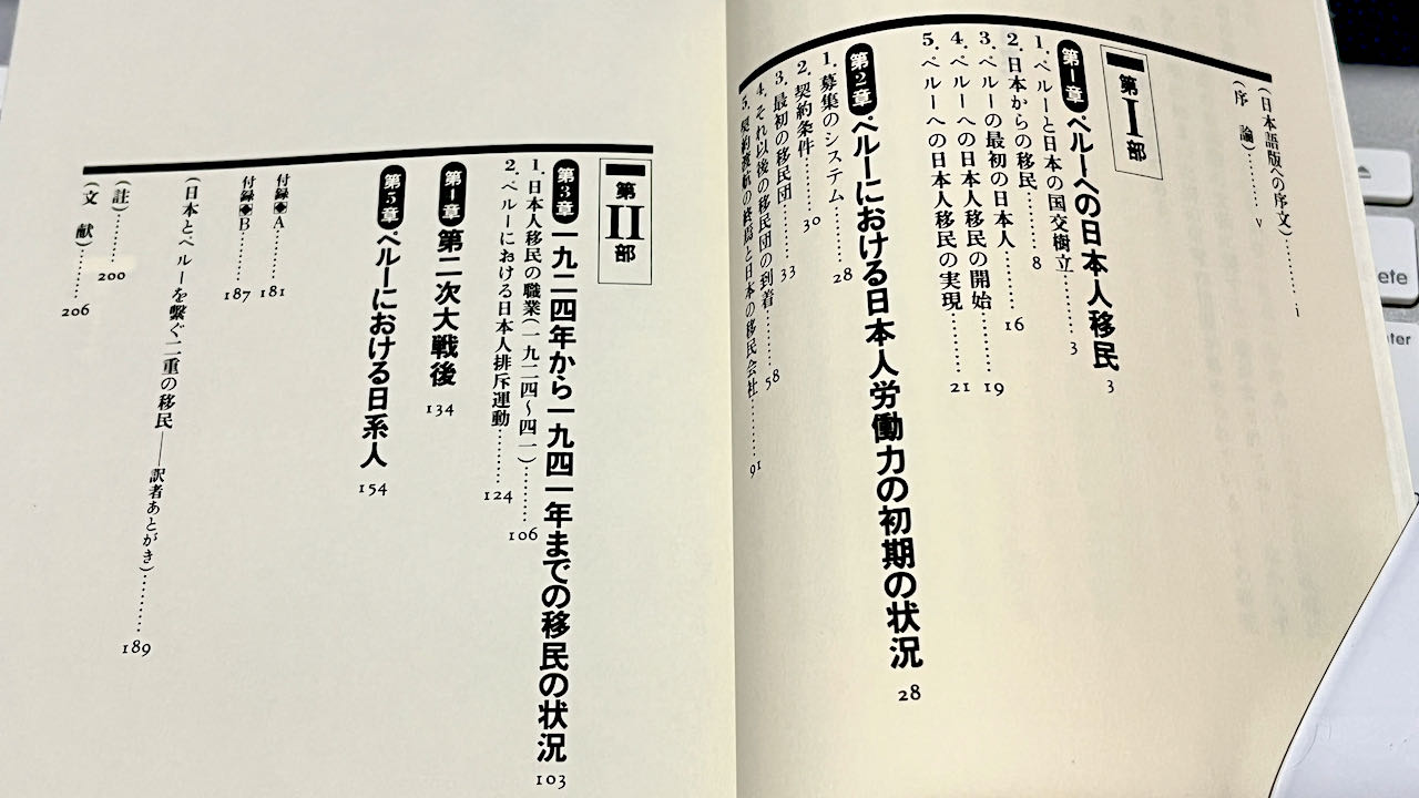この本の上巻十四章に「秘露移民開始」、十五章「秘露第一回移民就働後の紛擾(ふんじょう)」、下巻五章「忍苦節十年、秘露の同胞」、第十三章「秘露契約移民廃止と轉向(てんこう)商業者の発展」、第十七章「秘露同胞の現勢と移民制限令」とペルー移民の出来事を時系列で確認できます。