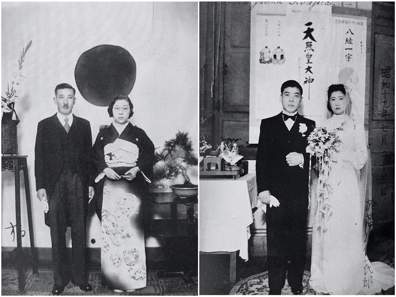 人生で一番晴れやかなセレモニーのひとつですが、右の写真のインパクトたるや。花嫁の洋装ではなく背景の「布袋尊、天照皇大神、八紘一宇」。これが日本本土ではなくペルーの写真。