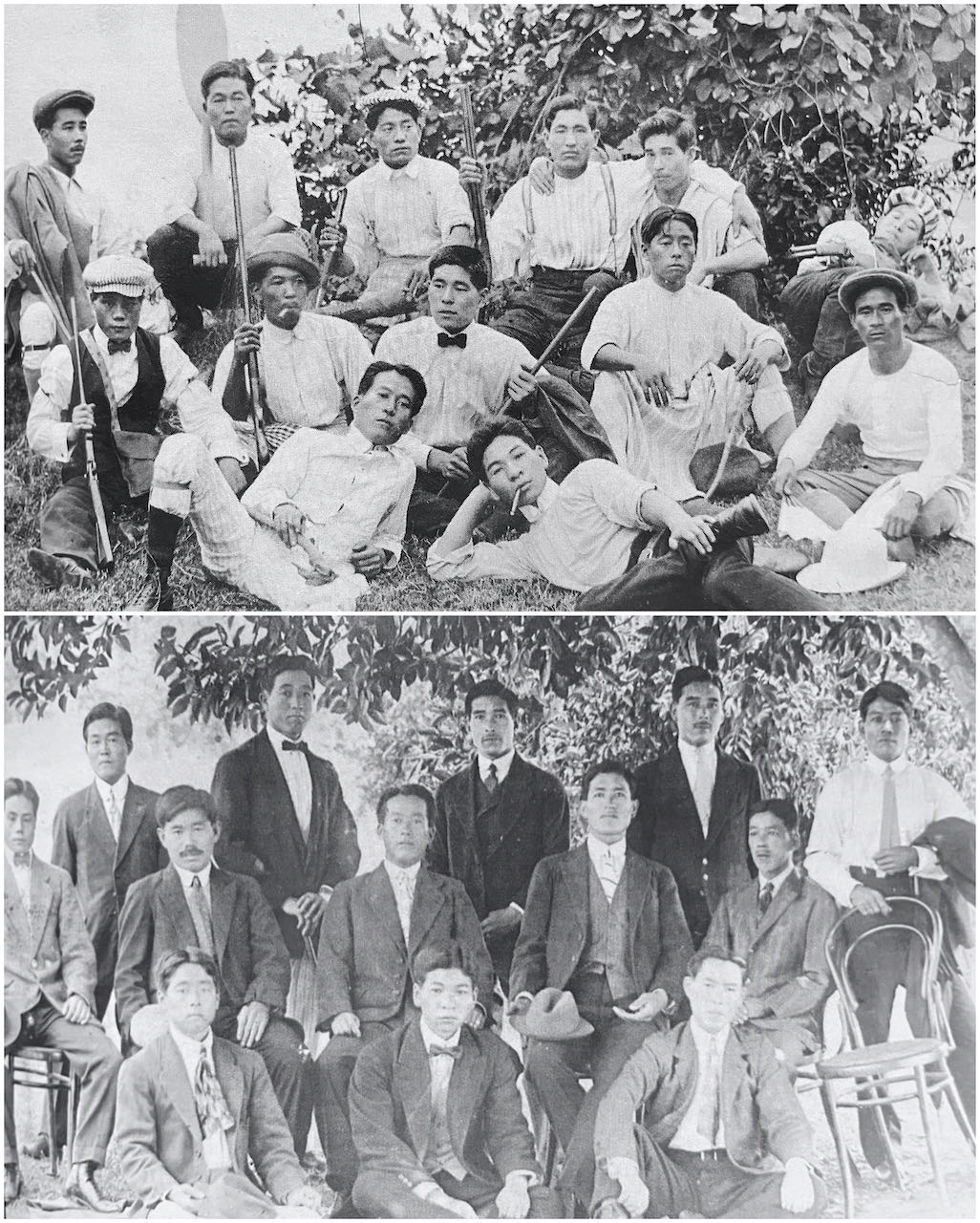 下の写真で左下の男性はアスコットタイのような、結び下げタイのような。これも時代と場所考えると珍しいでしょうね。今から100年前にアマゾン奥地で働いていた日本人移民の姿と思えばたくましさを感じますよね。