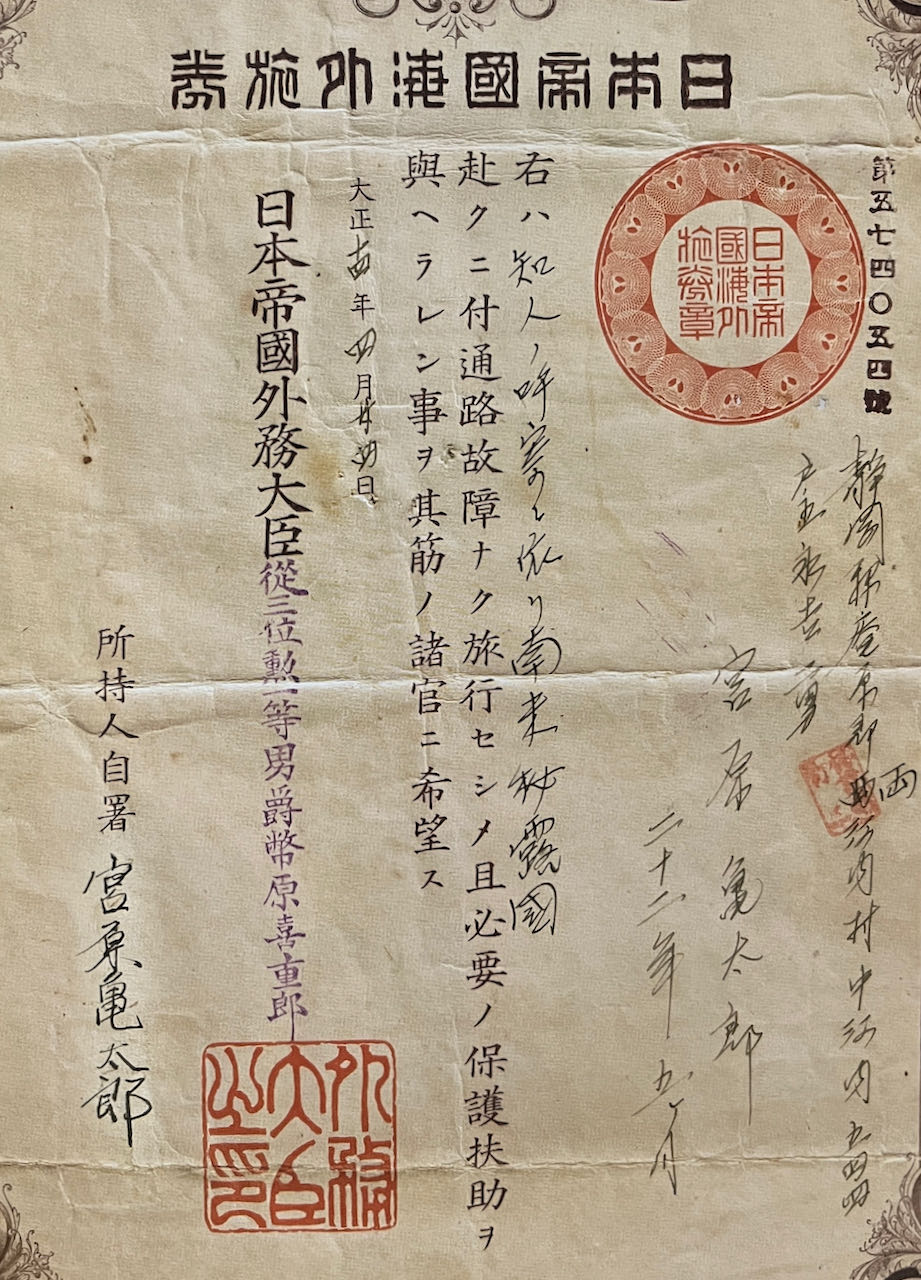 静岡の宮原亀太郎さんの旅券です。呼び寄せ移民であることが分かりますが、たった1枚の紙切れを生涯大事に握りしめて波乱の人生を旅されたんでしょうかね。