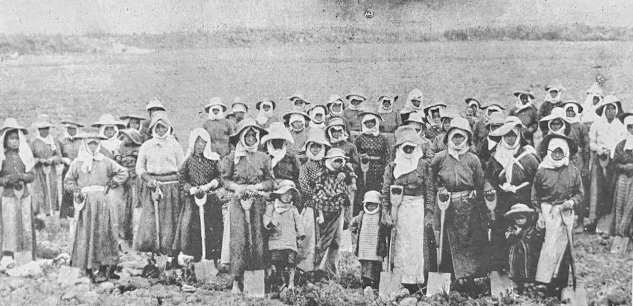 改めて綺麗な写真を眺めながら右側のたすき掛け姿の女性が気になりました。おそらくおんぶ紐で子どもを背負っての状況に見えます。この写真を見ながら私も小さいころ母親の背に背負われていたことを思い出しまた。昔の女性は赤子をおんぶしての仕事が普通でしたね。